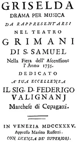 Griselda ist eine Oper (Musikdrama, Opera seria) in drei Akten von Antonio Vivaldi. Ihr liegt eine von Carlo Goldoni überarbeitete Version des 1701 auf der Grundlage von Giovanni Boccaccios Decamerone geschaffenen Librettos Griselda von Apostolo Zeno zugrunde.[1] Die Oper wurde am 18. Mai 1735 im Teatro San Samuele in Venedig uraufgeführt.