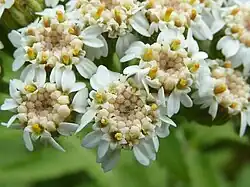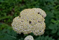 Die Blütezeit reicht von Juni bis Juli. Im schirmrispigen Gesamtblütenstand sind dicht vierzig bis hundert großen Blütenkörbchen angeordnet.[3] Die 4 bis 7 Millimeter große Hülle besteht aus mehr oder weniger schwarzrandigen, gefransten Hüllblättern. Jedes Blütenkörbchen hat einen Durchmesser 6 bis 8 Millimetern und enthält fünf bis sechs weiße, 1 bis 3 Millimeter lange Zungenblüten, die oft breiter als lang und kürzer als die Hülle sind. Die bräunlich-weißen Röhrenblüten umgeben den gelben Griffel, der in zwei Narben endet.