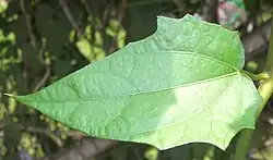 Die gegenständig angeordneten Laubblätter sind in Blattstiel und -spreite gegliedert. Der Blattstiel ist 2 bis 6 Zentimeter lang. Die einfache, raue und pergamentartige Blattspreite ist bei einer Länge von 6 bis 20 Zentimeter und einer Breite von 3 bis 14 Zentimeter ei-, herzförmig bis dreieckig mit stumpfer bis herzförmiger Spreitenbasis und zugespitztem oder spitzem oberen Ende. Unterhalb der Spreitenmitte ist der Blattrand manchmal ganz, sonst oft grob gelappt oder gezähnt. Die Nervatur ist handförmig.