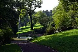 Die Große Fontäne im Schlosspark von Belvedere in Weimar mit Brunnenbecken ist ein Laufbrunnen, der über das Bewässerungssystem ausgehend vom Possenbach über den Schirmteich gespeist wird. Beigefügt sind Überläufe wie Wasserfall und Schöpfbecken. Der Springstrahl erreicht die Höhe von ca. 8 Metern. Den erforderlichen Wasserdruck erhält die Anlage über den Schirmteich. Er ist die erste Überlaufstufe der Großen Fontäne. Daneben befindet sich die sog. Kleine Grotte.[1]