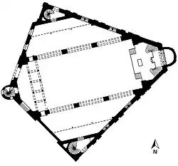 Die Synagoge hatte den Grundriss eines Drachenvierecks. Zwei Reihen mit jeweils vier Säulen grenzten das Hauptschiff von den Seitenschiffen ab, wobei die Seitenschiffe aufgrund des Grundrisses schräg abgeschnitten waren.[4] Im Westen befand sich ein Turm in der Mittelachse des Hauptschiffs. Zwischen den Außenmauern der Seitenschiffe und den äußeren Begrenzungsmauern befanden sich Zwickelräume, in die Türme mit Treppenhäusern eingebaut waren. Diese Türme ermöglichten den Zugang zur Frauenempore. An den Westturm auf der Mittelachse des Haupttrakts schloss sich nach Norden hin ein niedrigerer Baukörper mit Eingang, Vorhalle, Garderoben, Hof und einer kleinen Wochentagssynagoge an.