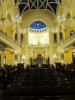 Die Bima, die nach orthodoxer Tradition ursprünglich in der Mitte des Raumes stand, wurde 1906 versetzt, um weitere Sitzplätze schaffen zu können. Die Frauenemporen befinden sich an den Längsseiten.