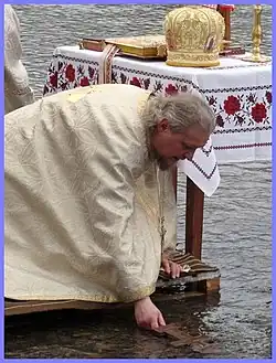 Die Gemeinde versammelt sich mit Prozessionsfahnen, mit der Festtags-Ikone, dem Kreuz und dem Evangeliar an einem Fluss oder See. Der Priester legt das Kreuz und das Evangelienbuch auf ein Analogion, dann werden Kerzen an die Gläubigen verteilt und angezündet. Der Priester beräuchert den Tisch, die Festtags-Ikone und alle Gläubigen, während die Liturgie gesungen wird. Dann taucht der Priester das Kreuz drei Mal in das Gewässer, das an diesem Tag mit seinem Wasser die ganze Schöpfung weiht. Die erwachsenen Gläubigen tauchen vielfach nacheinander in das Gewässer. In den russischsprachigen Ländern tauchen oft Mütter ihre Säuglinge in das eiskalte Wasser.[7]