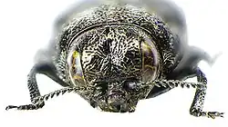 Der Kopf ist von oben betrachtet viel breiter als lang. Die Mundwerkzeuge mit den kräftigen Oberkiefern zeigen nach unten. Der viergliedrige Kiefertaster endet mit einem eiförmigen Endglied, das Endglied des dreigliedrigen Lippentasters ist groß und keulenförmig. Die großen Augen liegen auf der Kopfseite. Ihr Hinterrand verläuft parallel und in kleinem Abstand zum Seitenrand des Halsschildes. Die kurzen elfgliedrigen Fühler sind ab dem vierten Glied gesägt. Sie sind voneinander entfernt vor den Augen in deutlichen Fühlerhöhlen eingelenkt. Die mittleren Fühlerglieder sind breiter als lang.