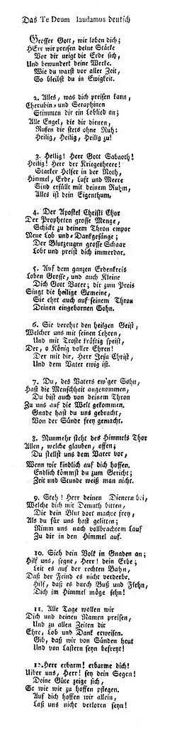 In den Kirchengesangbüchern in Deutschland und Österreich (Gotteslob Nr. 380, Evangelisches Gesangbuch Nr. 331, Mennonitisches Gesangbuch Nr. 34, Alt-katholisches Gesangbuch Nr. 550[8]) steht die von der Arbeitsgemeinschaft für ökumenisches Liedgut erarbeitete Textfassung; dazu hier in Synopse das Te Deum in der Übersetzung von Romano Guardini: