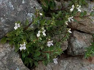 Die Tragblätter sind kleiner als die Laubblätter. Sie sind teilweise ganzrandig und ragen über die Kelche hinaus. Die Blütenquirle bestehen aus ein oder zwei Blüten. Diese sind 17 bis 23 Millimeter groß, kurz gestielt und weiß oder blasslila gefärbt. Ein aus schuppenförmigen Haaren bestehender Ring befindet sich in der Kronröhre. Die Oberlippe ist ungeteilt, länglich und gewölbt. Die Unterlippe ist dreiteilig, ihr Mittellappen ist groß. Es sind vier Staubblätter vorhanden. Der Kelch ist drüsig behaart oder kahl, schwach zweilippig und zehnnervig. Von ursprünglich 12 Millimetern vergrößert er sich zur Fruchtzeit auf bis zu 25 Millimeter. Die fünf Kelchzipfel sind eiförmig-lanzettlich und kurz begrannt. Die Früchte sind schwarz und 3 bis 4 Millimeter lang.[1]