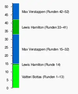 In der 26. Runde wechselte auch der Spitzenreiter des Grand Prix, Verstappen, die Reifen. Er beginnt mit harten Reifen und wechselte nun auf Mediums. Der Red Bull Racing-Pilot kehrte vor Hamilton, aber hinter Bottas auf die Strecke zurück. In der ersten Runde nach dem Stopp eroberte der Niederländer den ersten Platz allerdings bereits zurück und überholte den Finnen.