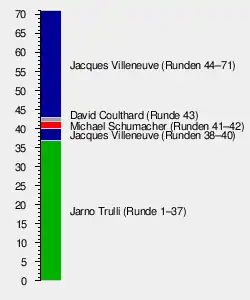 In derselben Runde ging Trullis Mugen-Honda-Motor in Führung liegend ebenfalls hoch. Villeneuve erhielt als Resultat den ersten Platz wieder, doch nur für zwei Runden. Diesmal war der Grund jedoch ein Boxenstopp. Michael Schumacher konnte für zwei Runden führen, musste dann in Runde 42 ebenfalls stoppen. Coulthard führte nun, aber musste gleich in der darauffolgenden Runde nachtanken, woraufhin Villeneuve wieder nach ganz vorne kam.