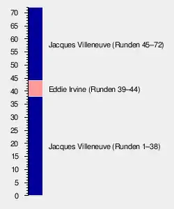 Villeneuve konnte, obwohl sich Irvine rasant näherte, seine Führung erfolgreich bis zum Ende behaupten und gewann damit das Rennen. Auf Platz drei folgte Ralf Schumacher, welcher in seinem dritten Rennen erstmals aufs Podium fuhr.[8] Bei dessen Zieldurchfahrt kam es zu einer Kontroverse, da das Jordan-Team nicht zur Wand der Box rannte, um die Zieleinfahrt zu feiern. Als offizieller Grund wurde angegeben, seit dem Rennen in Ungarn 1995 nicht mehr an der Boxenwand zu erscheinen, wenn ein Fahrer auf Platz drei läge. Bei diesem Rennen war nämlich Barrichello, der damals noch bei Jordan fuhr, auf Platz drei, konnte aber seinen Platz nicht bis zum Ziel halten. Es zeigte sich, dass das Team dennoch feierte, wenn ein Fahrer auf Platz drei liegt. Dadurch bedingt verstärkten sich die Gerüchte, dass es aufgrund des Unfalls zwischen Fisichella und Schumacher zu keiner Feier kam. Später meinte Eddie Jordan, dass er mit der jetzigen Fahrerkonstellation zufrieden sei und er die beiden gegen kein anderes Duo tauschen wolle. Die restlichen Punkteplatzierungen belegten Johnny Herbert, Mika Häkkinen und Berger.