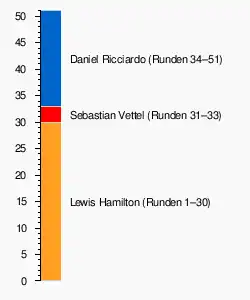Hamilton führte vor Vettel, Ricciardo, Stroll, Magnussen, Alonso, Sainz jr., Ocon, Bottas und Grosjean. Ocon und Bottas überholten in Runde 30 bzw. 31 Sainz jr.