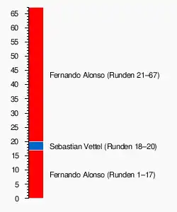 - ↑ Vettel bekam eine 20-Sekunden-Zeitstrafe für das Verlassen der Strecke und einen erzielten Vorteil bei der Rückkehr.