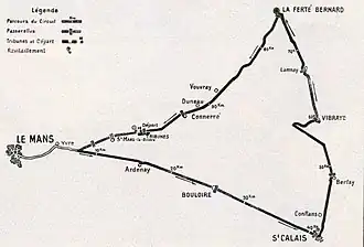 Zum Austragungsort für das erste Grand-Prix-Rennen der Geschichte wurde nach Zahlung einer ansehnlichen Summe aus den umliegenden Gemeinden mit dem Circuit de la Sarthe[2] ein 103,18 km Rundkurs in der Nähe von Le Mans erkoren, der mit einer Gesamtdistanz von 1238,16 km an zwei Tagen insgesamt zwölfmal umrundet werden musste. Dabei wurden die Teilnehmer am ersten Tag wie in dieser Epoche üblich in festen Zeitabständen ins Rennen geschickt. Die Startzeit jedes Teilnehmers am zweiten Tag entsprach jedoch seiner am Vortag erzielten Gesamtzeit, so dass zum ersten Mal in einem bedeutenden Rennen der erste Wagen im Ziel automatisch auch der Gesamtsieger war.