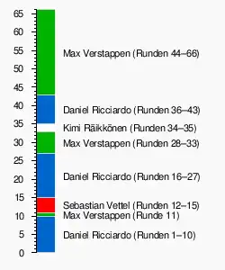Ricciardo setzte Vettel unter Druck und ging in der 59. Runde beim Anbremsen der ersten Kurve vorbei, dabei verbremste er sich jedoch, so dass Vettel kontern konnte und wieder den dritten Platz übernahm. Grosjean stellte währenddessen sein Fahrzeug mit Bremsproblemen ab. Obwohl er konstant im DRS-Fenster lag, schaffte Räikkönen es nicht, einen Angriff auf Verstappen zu starten. Ricciardo setzte Vettel weiterhin unter Druck, erlitt in der 65. Runde dann jedoch einen Reifenschaden hinten links. Er fuhr anschließend zum Reifenwechsel an die Box und kam kurz vor Bottas auf die Strecke zurück.