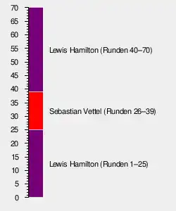Hamilton kam in Runde 25 an die Box und übergab die Führung an Vettel. Dieser blieb zunächst draußen und absolvierte seinen Boxenstopp erst in Runde 39. Aufgrund von langsameren Rundenzeiten gegenüber Bottas, kam er hinter dem Finnen auf die Strecke zurück.