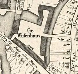Nach dem Dreißigjährigen Krieg wurde dem Hospital das als „Arbeits- und Irrenhaus“ genutzte Alexiusspital (auch „Kornhaus“ genannt) angegliedert[2] und das Hospital wurde 1677 zum „Armen-, Waysen-, Zucht- und Werkhaus“ umgestaltet.[3] Erst ab Mitte des 18. Jahrhunderts wurden die Waisenkinder von den übrigen Heimbewohnern getrennt untergebracht.
