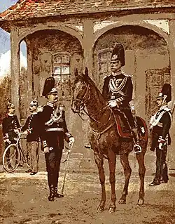 - dem Stab (1 Kommandierender Ober-Offizier, 1 Quartiermeister, 1 Trompeter)