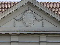 Am Giebel ist vorne das (nur in Anteilen erhaltene) Großherzogliche Wappen als Stuckornament eingefasst. Auf der Rückseite befindet sich indes ein Halbbogenfenster an entsprechender Stelle. Kern des Gebäudeinnern ist eine große Eingangshalle, das Foyer, dessen Ausstattung in weißen und beige-gelben Tönen gehalten ist. Sie wird im Erdgeschoss von korinthischen Säulen gehalten. Eine Treppe mit schwarzem und reich verzierten Geländer führt hinter diesen in den ersten Stock. Links und rechts im Foyer, zwischen Eingang und Säulen, befindet sich jeweils ein großer Kamin mit einem reich verzierten Spiegel darüber.