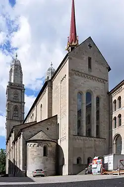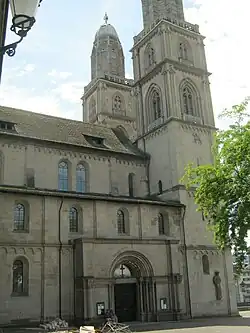 Das Grossmünster ist eine romanische Kirche in der Altstadt von Zürich, erbaut zwischen 1100 und 1220. Die erste Altarweihe war 1104 für die Krypta und 1107 für den Chor. Die Schlussweihe erfolgte 1117 durch Erzbischof Bruno von Trier.[1] Bis zur Reformation war das Grossmünster zugleich Teil eines weltlichen Chorherrenstifts und Pfarrkirche; die Kirchenpatrone waren Felix und Regula sowie Exuperantius. Die Gräber mit den Reliquien der beiden erstgenannten, die zugleich als Stadtpatrone gelten, befanden sich in der Zwölfbotenkapelle an der Stelle des heutigen Treppenhauses.[2] Die Pfarrei Grossmünster war der Ausgangspunkt der Reformation durch Huldrych Zwingli (1522–1525), und heute dient das Grossmünster als Pfarrkirche der evangelisch-reformierten Landeskirche.