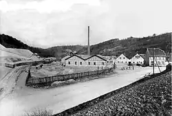 Hauptschacht der Grube Lüderich mit Maschinenhaus 1902, das Wasser wird für die Aufbereitung in einen Hochbehälter gepumpt
