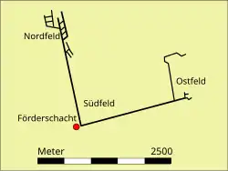Der Abbau der Braunkohle erfolgte in drei Feldern: Nordfeld, Ostfeld und Südfeld.