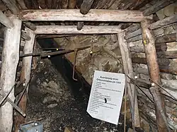 Der Grubenausbau aus Holz wird als Grubenzimmerung bezeichnet.[6] Alle Holzarten eignen sich für die Grubenzimmerung; einige Holzarten haben sich besonders bewährt. Am besten eignen sich harte oder auch harzreiche Hölzer.[7] Das Holz muss eine bestimmte Dicke und Festigkeit haben.[6] Für die Grubenzimmerung gut geeignete Hölzer sind harte Laubhölzer wie Eiche, Buche und Erle oder Nadelhölzer wie Tanne und Fichte.[8] Grubenzimmerung aus Eichenholz ist besonders beständig gegen Feuchtigkeit, hohe Temperaturen und sogenannte stockende Wetter. Damit die Grubenzimmerung beständig gegen Feuchtigkeit und Fäulnisbildung wird, werden die Hölzer über Tage mit Salzlösungen imprägniert. Dabei dringt die Salzlösung in das Holz ein und verdrängt die Holzsäfte.[6] Holz als Ausbaumaterial hat die Vorteile, dass es kostengünstig zu beschaffen und leicht zu bearbeiten ist, außerdem hat Holz gegenüber anderen Ausbaumaterialien ein geringeres Gewicht. Nachteilig beim Holz ist, dass es nach einem Einsatz meistens nicht wieder verwendet werden kann. Auch lässt sich Holz nicht überall einsetzen; es ist brennbar, nicht witterungsbeständig und widersteht nur einer geringen Druckbelastung. Die Lagerhaltungskosten und die Transportkosten sind relativ hoch.[9]