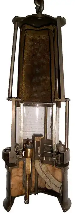 Im 17. Jahrhundert kamen Blenden in Gebrauch, bei denen in einer hölzernen Umhüllung eine Kuckuck genannte Öllampe oder eine Kerze brannte. Alexander von Humboldt entwickelte zwischen 1792 und 1797 als (Ober-)Bergmeister in Franken eine „lichterhaltende Lampe“ zum Gebrauch in Gruben, die durch zusätzliche Luft- und Wasserzufuhr in kleinen Mengen verhindern sollte, dass das brennende Licht unter Tage erlosch.[4] Im 19. Jahrhundert wurden mehrere neue Lampentypen entwickelt. Zu den Öllampen traten Gaslampen, Kerosinlampen und insbesondere nach der Erfindung des Karbids die Karbidlampe, die ein stärkeres Licht abgab. Mit deren Einführung war der letzte Schritt in der Entwicklung des Geleuchtes mit offener Flamme getan.