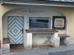 (Gstättengasse 4) Dieses Haus besitzt, hervorragend erhalten, den ältesten erhaltenen Verkaufsladen der Altstadt – die älteste Bäckerei Salzburgs war es dagegen entgegen der Aufschrift nie, die Klosterbäckerei (Pfisterei) St. Peter ist deutlich älter (siehe Kapitelplatz). Die gedrückte Rundbogennische ist von einem Ladenfenster und einer Türe durchbrochen. Unter dem Fenster findet sich noch straßenseitig der originale spätmittelalterliche Verkaufstisch, der ebenso wie die beiden Bänke zu beiden Seiten mit einer Marmorplatte gedeckt ist. Auch im Inneren des Hauses ist die Anlage des spätmittelalterlichen Gewerbebetriebes gut erhalten. Der bis etwa 1995 jahrhundertelang für Bäckerwaren genutzte Verkaufsladen zeigt, dass der Käufer in der Regel von der Gasse aus bedient wurde.