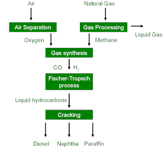 Beim GtL-Verfahren wird Erdgas durch Zufuhr von Sauerstoff und Wasserdampf zu Synthesegas und dieses in einer Fischer-Tropsch-Synthese zu Kohlenwasserstoffen umgewandelt. Der Hauptanteil des Produktgemisches aus der Fischer-Tropsch-Synthese besteht aus langkettigen wachsartigen Normalparaffinen, die erst durch Cracken und Isomerisierung in einem speziellen Hydrocracker (und anschließender Fraktionierung) in flüssige Kohlenwasserstoffe umgewandelt werden müssen. Nach dem Crackprozess entsteht Kraftstoff für Motoren.