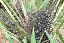 Die Frucht entwickelt sich nur aus einem Fruchtblatt. Sie ist rund bis ellipsoidisch, von blau-schwarzer Farbe und hat eine dünne, weiße Wachsschicht. Der Narbenrest steht apikal, die nicht entwickelten Fruchtblattreste basal. Das Exokarp ist kahl, das Mesokarp sehr dünn und fleischig, das Endokarp papieren. Der Samen ist an einer Seite abgeflacht, hat einen seitlichen Nabel (Hilum) und einen deutlich ausgeprägten Einwuchs des Integuments. Das Endosperm ist homogen. Der Embryo sitzt lateral.