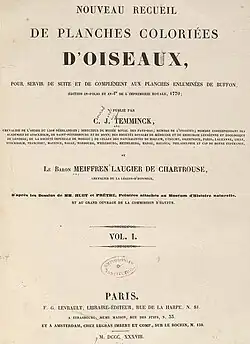 Als Coenraad Jacob Temminck im Januar 1820 Paris besuchte, machte er Baron Meiffren de Laugier einen Besuch. Da Meiffren de Laugier eine bedeutende Sammlung exotischer Vögel hatte, lenkte er das Gespräch auf ein Projekt, das er schon seit geraumer Zeit im Kopf hatte. Edme-Louis Daubenton (1730–1785) hatte 973 Vogeltafel für Georges-Louis Leclerc de Buffons (1707–1788) Histoire Naturelle, générale et particulière, avec la description du Cabinet du Roi produziert. Meiffren de Laugier wollte diese Tafel vervollständigen, doch fehlte ihm die Expertise alleine den Text dazu zu schreiben. Temminck war von der Idee sofort begeistert und so engagierte er seine Lieblingsillustratoren Jean-Gabriel Prêtre (1768–1849) und Nicolas Geneviève Huet (1767–1830), um die von ihm zusammengestellten Vögel mit handkolorierten Farbtafeln zu illustrieren. Am 1. September 1820 erschien die erste Lieferung des mehrbändigen Werkes unter dem Namen beider Autoren.[4] Auch wenn die Bände das Jahr 1838 ausweisen, erschien diese in 102 Lieferungen zwischen 1820 und 1839. In einer Publikation von Charles Davies Sherborn aus dem Jahre 1898 eruierte dieser die genauen Publikationsdaten der einzelnen Lieferungen.[5] 1922 erweiterte Erwin Stresemann diese mit Erkenntnissen aus dem Museum für Naturkunde in Berlin.[6] Charles Payraudeau (1786–1865) publizierte 1826 zum Teil über die Eigentlichen Störche kritische Anmerkungen.[7] 1836 publizierte Meiffren de Laugier einen Katalog mit allen Vögeln aus seiner Sammlung. Heute befinden sich Teile seiner Sammlung im Natural History Museum at Tring[8], im Muséum national d’histoire naturelle[9] und im Museum für Naturkunde in Berlin[10].