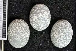 Typischerweise legen bis zu sieben Weibchen in ein Gemeinschaftsnest, die Zahl der Eier ist umso höher je mehr Weibchen zu einem Trupp gehören. Die Gelegegröße beträgt zwischen 4 und 20 Eier. In einem Fall wurden 30 Eier in einem Nest gezählt.[4] Die Eier sind im Verhältnis zum Körpergewicht des Guirakuckucks groß. Der Legeabstand eines individuellen Weibchens beträgt zwei Tage, nur in Ausnahmefällen ist sie in der Lage, ein Ei bereits am nächsten Tag zu legen.