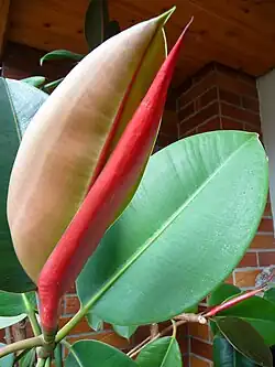 Die wechselständigen Laubblätter sind in Blattstiel und Blattspreite gegliedert. Der Blattstiel ist 2 bis 5 cm lang. Die einfache ganzrandige, ledrige Blattspreite ist 8 bis 35 Zentimeter lang und 5 bis 15 Zentimeter breit. Die Blattoberseite ist glänzend dunkelgrün und die Blattunterseite ist hellgrün. Die Blattgröße ist bei jungen Pflanzen, die in der Natur mit dem wenigen Licht im Unterholz auskommen müssen, am größten (gelegentlich bis 45 Zentimeter) und viel kleiner bei älteren Bäumen. Die Nebenblätter sind zu einem großen Nebenblatt verwachsen, das das junge Blatt vor der Entfaltung wie eine Tüte schützt. Es ist meist dunkelrot, etwa 10 cm lang und wird beim Entfalten des Blattes abgestoßen. Die Blätter enthalten Zystolithen.