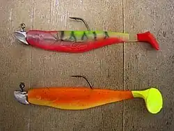 Als Gummifisch im engeren Sinne bezeichnet man lediglich den eigentlichen, aus Gummi bzw. Weichplastik bestehenden, Köder, der in Form und Größe einem Beutefisch ähnelt. Für die Verwendung beim Jiggen muss ein Gummifisch allerdings auf einen langschenkligen Angelhaken aufgezogen werden, der mit einem Bleigewicht versehen ist. Auf diesen Haken wird der Gummifisch so aufgezogen, dass die Hakenspitze aus dem „Rücken“ des Gummifisches herausschaut, während das Bleigewicht unmittelbar am „Maul“ sitzt. Diese bebleiten Haken werden als Jigköpfe bezeichnet.