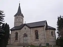 Die Saalkirche, ein Bau aus Natursteinmauerwerk, wurde 1885 anstelle der Vorgängerkirche aus dem 17. und 18. Jahrhundert errichtet. Sie hat eine eingezogene polygonale Apsis, einen Risalit mit dem Portal im Süden und einen eingezogenen quadratischen Kirchturm mit vier Geschossen im Westen. Das oberste Geschoss des Turms ist an allen Seiten mit dreieckigen Bekrönungen versehen. Dazwischen erhebt sich ein schiefergedeckter achtseitiger spitzer Helm. Die Kirchenausstattung ist einfach. Die Orgel mit 7 Registern, verteilt auf ein Manual und ein Pedal, wurde um 1885 von einem unbekannten Orgelbauer gebaut.[2]