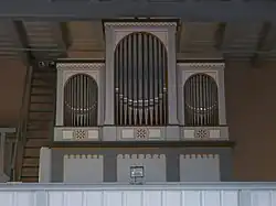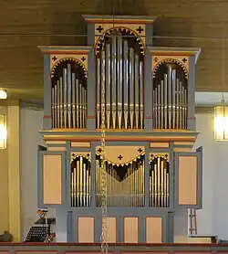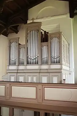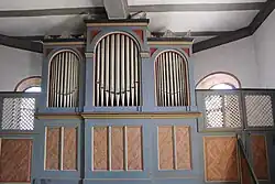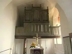 II/P | 13 | Das untere Manual ist das Hauptwerk mit 9 Register, das obere ist Nebenwerk mit 2 Registern.[2] (Gedackt d’amour 8′ und Flöte 4′).[3] Die allermeisten Bauteile stammen tatsächlich noch aus dem 19. Jahrhundert, nur die Prospektpfeifen und der Blasebalg sind erneuert worden. 1969 und 1997 aufwendige Renovierung.[2] |