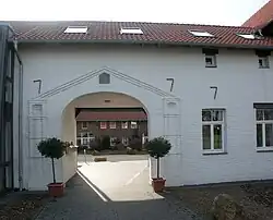 Der Ostflügel mit seiner weiß gestrichenen Außenmauer aus Backstein beherbergt heute – ebenso wie der Südflügel – Büroräume. Eiserne Maueranker in Form von Ziffern künden vom Baujahr des Gebäudes: 1775;[2] wobei der Maueranker mit der Ziffer 5 heute nur noch schwer zu entdecken ist, da er von einem Fallrohr verdeckt wird. Sein Rundbogenportal wird von gemauerten Pilastern eingerahmt und ist mit einem Flachgiebel bekrönt, der eine Wappenplatte mit der Jahreszahl 1749 trägt.