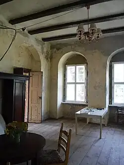 Das Obergeschoss war die Wohnetage. Die Räume im Obergeschoss haben eine Höhe von 3,8 Meter und verfügen über Kachelöfen. Die Fenster dieser salonartigen Räume liegen in Rundbogennischen. Die Wände waren mit schlichten Bemalungen und Walzenmustern verziert. Der Sockelbereich war blaugrau marmoriert und von den hellen Wandflächen durch eine weinrote Linie abgetrennt. In der Südfront befinden sich drei große Räume mit repräsentativen Proportionen. Über Flügeltüren bilden sie eine zusammenhängende Zimmerflucht. Nördlich der Hausmittelwand verläuft mittig die Diele des Treppenhauses. Westlich schließt sich das Jagd- oder Herrenzimmer mit dunkel gebeizten Deckenbalken an.