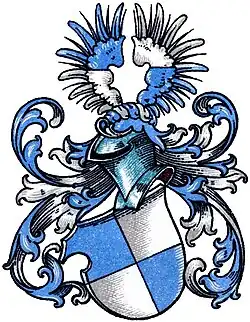 Blasonierung: Von Blau und Silber geviert. Auf dem blau-silbern bewulsteten Helm mit blau-silbernen Helmdecken ein offener blau-silbern geteilter Flug in gewechselten Farben.[1]
