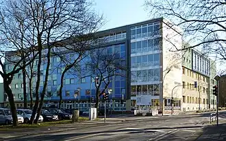 Auf dem ca. drei Morgen großen Schulgelände[56] musste im Vorgriff auf die zu Ostern 1915 nach längeren Verhandlungen umgesetzte Verschmelzung mit der Eickeler „Privaten gehobenen Mädchenschule“ bereits nach wenigen Jahren ein Erweiterungstrakt in Angriff genommen werden, der 1913/14 durch einen Anbau entlang der Stöckstraße erfolgte.[2] Nach der Rückkehr aus der kriegsbedingten Evakuierung fanden die Schülerinnen und Lehrer im Juni 1945 die Klassenräume und Amtszimmer der vergleichsweise gering beschädigten Lehranstalt durch städtische Dienststellen zweckentfremdet vor; Turnhalle und Aula waren verwüstet.[4]:15 Hinzu kam, das die Schüler des Jungengymnasiums Eickel bis 1949 wegen der starken Kriegsschäden an ihrer Schule aufgenommen werden mussten[4]:16 und von 1946 bis 1947 auch das Stadtarchiv seine Depositen in den Räumen des Mädchengymnasiums unterbrachte. Da diese in diesem Zeitraum frei zugänglich waren erlitten sie durch Verwendung als Brandmaterial größere Verluste.[57] Während die Aula bis zum Sommer 1953 wiederhergestellt werden konnte, erfolgte im Schuljahr eine vollständige Überholung des Gebäudeinnern und die Neugestaltung des Schulhofes.[4]:16 Für den Sommer 1956 war dann ein weitergehender Umbau nebst Erweiterung vorgesehen,[4]:17 der dann aber erst 1960 mit dem Teilabbruch des Gebäudetraktes an der Gerichtsstraße (Aula, Turnhalle und Hausmeisterhaus) eingeleitet wurde. Bis 1962 erfolgte ein Neubau des Klassentraktes an der Gerichtsstraße, sowie einer Turn- und Gymnastikhalle (Lage) im Bereich des bisherigen Schulhofs und der Umbau des Flügels an der Stöckstraße zu einem Fachraum- und Verwaltungstrakt. Dabei wurde auf diesen dreigeschossigen Trakt eine Aula aufgesetzt. In den Jahren 2009 bis 2011 gelang es dann die Renovierung der Turnhalle und der naturwissenschaftlichen Räume zu realisieren sowie Sanierungsmaßnahmen (Fenster und Fassade) durchzuführen.[8]