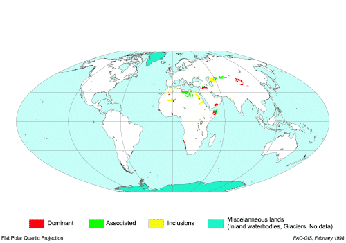 Der Gypsisol ist ein Bodentyp, der in Trockengebieten vorkommt.[8] Er entsteht meistens aus Lockergesteinen kolluvialer, alluvialer oder äolischer Genese. Gypsisole sind häufig in Senken von ausgetrockneten Seen, aber auch auf Flussterrassen, die einen hochliegenden Grundwasserspiegel haben,[1] sowie auf freiliegenden alten Gipsschichten vorzufinden. Die Verbreitungsräume sind damit klein und an besonderen Standorten.[3]