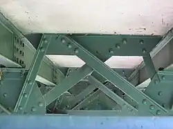 Der Brückenüberbau mit 72 Meter Stützweite ist über die Tragseile an Hängestäben aus Rundstahl aufgehängt. Die Rundstäbe haben einen Durchmesser von 40 mm und sind über Konsolen an den Fachwerkpfosten der Hauptträger befestigt. Seile und Stäbe wurden, um die Brücke in Querrichtung auszusteifen, in eine unter 1:6 geneigte Ebene gelegt.
