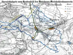 Der Hänichener Steinkohlenbauverein konstituierte sich am 3. Oktober 1846.[1] Am 7. November 1846 wurde der Hänichener Steinkohlenbergbauverein zu Dresden mit einem Aktienkapital von 180.000 Mark gegründet. Dem folgten 2 Kapitalerhöhungen. Im Jahr 1850 um 240.000 Mark und im Jahr 1853 um 300.000 Mark. Der Nennwert der Aktien betrug jeweils 300 Mark.[2] Das Grubenfeld umfasste neben der Flur von Hänichen auch die von Wilmsdorf und Rippien. Als ersten Schacht teufte man 1846 den Beckerschacht in Hänichen. Dazu kamen 1850 der Beharrlichkeitsschacht in Rippien und 1852 der Berglustschacht in Wilmsdorf. Es handelte sich durchweg um moderne, tiefe Schachtanlagen mit massivem Treibehaus („Malakoffturm“) und Dampffördermaschine. Problematisch war die Lage des Grubenfeldes im Bereich der größten Verwerfungen im Döhlener Becken, dem „Roten Ochsen“ mit einer Sprunghöhe von mehr als hundert Metern und der vorgelagerten „Beckerschachtverwerfung“. Dazu kam noch eine geringe Mächtigkeit des Flözes von zwei bis drei Metern, die den Abbau vergleichsweise teuer machte.