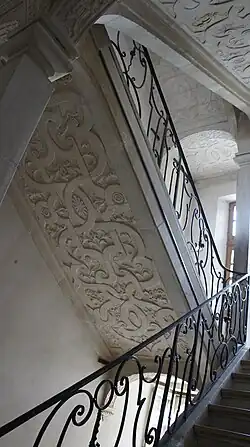 Das Gebäude im Stil der Renaissance besitzt einen quadratischen Grundriss von circa 15 Meter Seitenlänge. Es wird von einem mit Schiefer gedeckten Walmdach abgeschlossen. Das Portal wird von zwei eingestellten Säule gerahmt und von einer Supraporte geschmückt. Die Säulen ruhen auf 1,50 Meter hohen Sockeln. Die Fenster aller Geschosse sind mit Hausteinen gerahmt und im Erdgeschoss und im ersten Obergeschoss von gesprengten Giebeln bekrönt. Drei Gargouilles aus Stein mit Blattdekor schmücken den Dachabschluss. Im Inneren sind eine Renaissancetreppe und Stuckdecken erhalten.