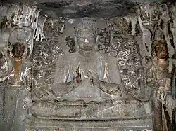 Die Buddhafigur befindet sich zentral in der Cella und tritt von der Rückwand weg, so dass sie umgehbar ist. Die Figur sitzt im Lotossitz auf einem Löwenthron, d. h. an der Thronbasis liegt dem Buddha links und rechts je ein Löwe zu Füßen. Über der Figur ist in das Gestein ein Heiligenschein in Form einer Lotosblüte ausgearbeitet worden. Der Buddhafigur stehen keine Bodhisattvas als Begleiter zur Seite, was ein Indiz für die frühere Phase ist. Weitere Merkmale für frühere Darstellungen sind sowohl die Positionierung in der Mitte der Cella, als auch die Proportion des Kopfes. Der verhältnismäßig große Kopf befindet sich weit vor dem Heiligenschein.