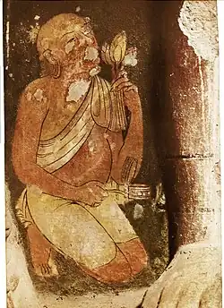 Die Wände waren einst alle bemalt. Heute sind die Farben bis auf wenige Ausnahmen verloren gegangen. Die interessanteste erhaltene Malerei, die sich im oberen Geschoss befindet, ist die eines Mönchs, an der rechten Seitenwand der Haupthalle. Der Verehrer oder Mönch hält in seiner rechten Hand ein Weihrauchgefäß und in seiner Linken drei Lotosblüten. Die Blüten sollen das triratna repräsentieren, das den Buddha, die Ordnung und das Gesetz im Buddhismus symbolisieren. Dieses Bild wurde zu einer der meist publizierten Malereien in Ajanta.