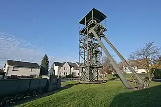- Das Industriedenkmal am Marktplatz in Höhn. Das Denkmal besteht aus einem Fördergerüst und einer Grubenbahn der 1961 stillgelegten und 1989 abgerissenen Braunkohlengrube Alexandria, der größten Grube des Westerwälder Braunkohlereviers.