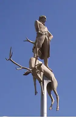 Auf der Spitze des rechten, höheren Trägers liegt mit hängenden Beinen und hängendem Kopf der erlegte Württemberger Hirsch. Breitbeinig und in selbstbewusster Pose steht der einstige Landesherr Carl Eugen, Herzog von Württemberg, auf dem Tier. Er bildet den oberen Abschluss des Kunstwerks und ist in dieselbe Richtung gewandt wie die beiden Hölderlinfiguren. Auf den erwachsenen Hölderlin blickt er mit strenger Miene herab.