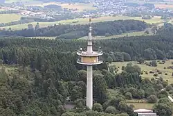 Auf dem Höllberg steht der 93 Meter hohe Fernmeldeturm Höllberg (Typenturm vom Typ FMT 11). Der Fernmeldeturm wurde Ende der 1970er Jahre erbaut und ersetzte den damaligen veralteten Stahlturm. Der Typenturm maß zunächst 108 Meter Höhe, doch 1990 wurden die obersten 15 Meter der Spitze im Rahmen des Ausbaues des Siegerland-Flughafens wieder entfernt.[3] Die oberste Betonplattform hat eine Höhe von 78 Meter, die darauf aufgesetzte Stahlspitze noch einmal eine Höhe von 15 Metern, so dass der Turm mit 93 Meter Höhe auf dem Höllkopf ragt und den nahen Windkrafträdern der Fuchskaute noch paroli bietet.