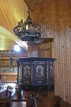Auch die Kanzel mit gemalten Tafeln, auf denen die Evangelisten abgebildet sind, und Skulpturen von zwei Engeln mit zwei Wappen darüber stand ursprünglich in der alten Kirche. Die Urheberschaft sowohl der Kanzel als auch des Altars wird dem Zipser Holzschnitzer Johann Lerch aus Kesmark oder einem Meister in seinem Kreis zugeschrieben.[8] Das Taufbecken aus Sandstein stand wahrscheinlich ebenfalls bereits in der alten Kirche.