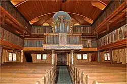 Die neue Blockbaukirche, die aus Fichten- und Tannenholz gefertigt wurde, dürfte nach Vorgaben der Komitatsbehörden nur bis zu einem Fuß dicke Fundamente gehabt haben. Den Grundriss bildet ein langgestrecktes Kreuz. Sie ist einschließlich des später erbauten Turms 43 m lang und hat 12 Türen und 72 Fenster. Der Haupteingang befindet sich ungewöhnlicherweise auf der Ostseite, somit gelangt man im Inneren zuerst in den Altarraum. Der ursprüngliche Haupteingang lag wahrscheinlich unter der Orgelempore auf der Westseite. Für jeden Arm gibt es separate Eingänge, die für Gläubige aus genau festgelegten Gemeinden der Unter- und Mittelliptau bestimmt waren.[4] Das Hauptschiff ist 37 m lang und 11,1 m breit, das Querschiff 27,75 m lang und 11 m breit. Die bebaute Fläche (ohne Turm) beträgt 658 m², die Nutzfläche 1150 m². Die großzügig angelegte Kirche bietet Platz für mehrere Tausend Besucher, je nach Quelle von 4000 bis 6000.[5] Wegen der Lage auf einem Hang ist die Neigung noch heute erkennbar, das Bodengefälle zum Altar hin beträgt etwa 1,3 m. Überdacht ist der Bau mit zwei Satteldächern und Tonnengewölben mit Spannweiten von 12 bis 13 m.[6]
